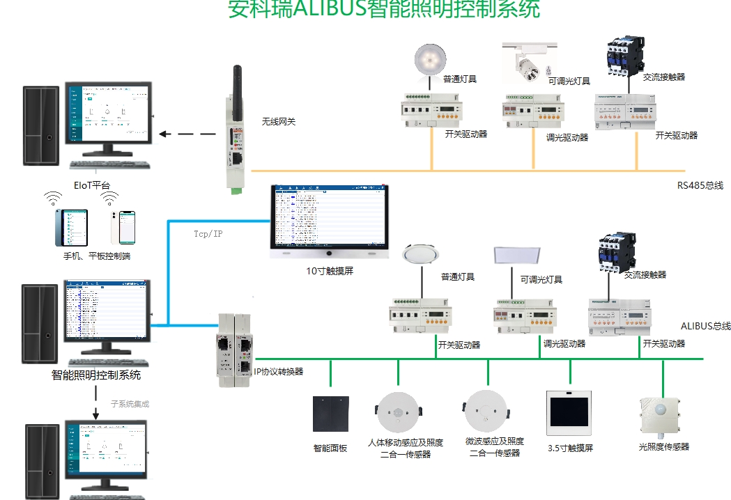 智能照明控制系統是安科瑞新一代自有知識產權的照明控制解決方案,基于成熟的RS485通訊控制技術。同時創新地引入了載波偵聽和沖突碰撞檢測機制,多機間的實現了實時雙向通訊。線材使用的超六類屏蔽網線,一次性解決通訊與供電問題。整個系統由輸出設備、輸入設備和系統元件。輸出設備負責接收和處理傳感器傳送的信號,并執行相應的操作,如開/ 關燈、調節燈的亮度。輸入設備負責根據現場手動操作,或探測光線、人體運動等變化,向驅動器發出相應的控制信號。系統元件主要負責搭建系統平臺,如IP協議轉換器、中繼器等。