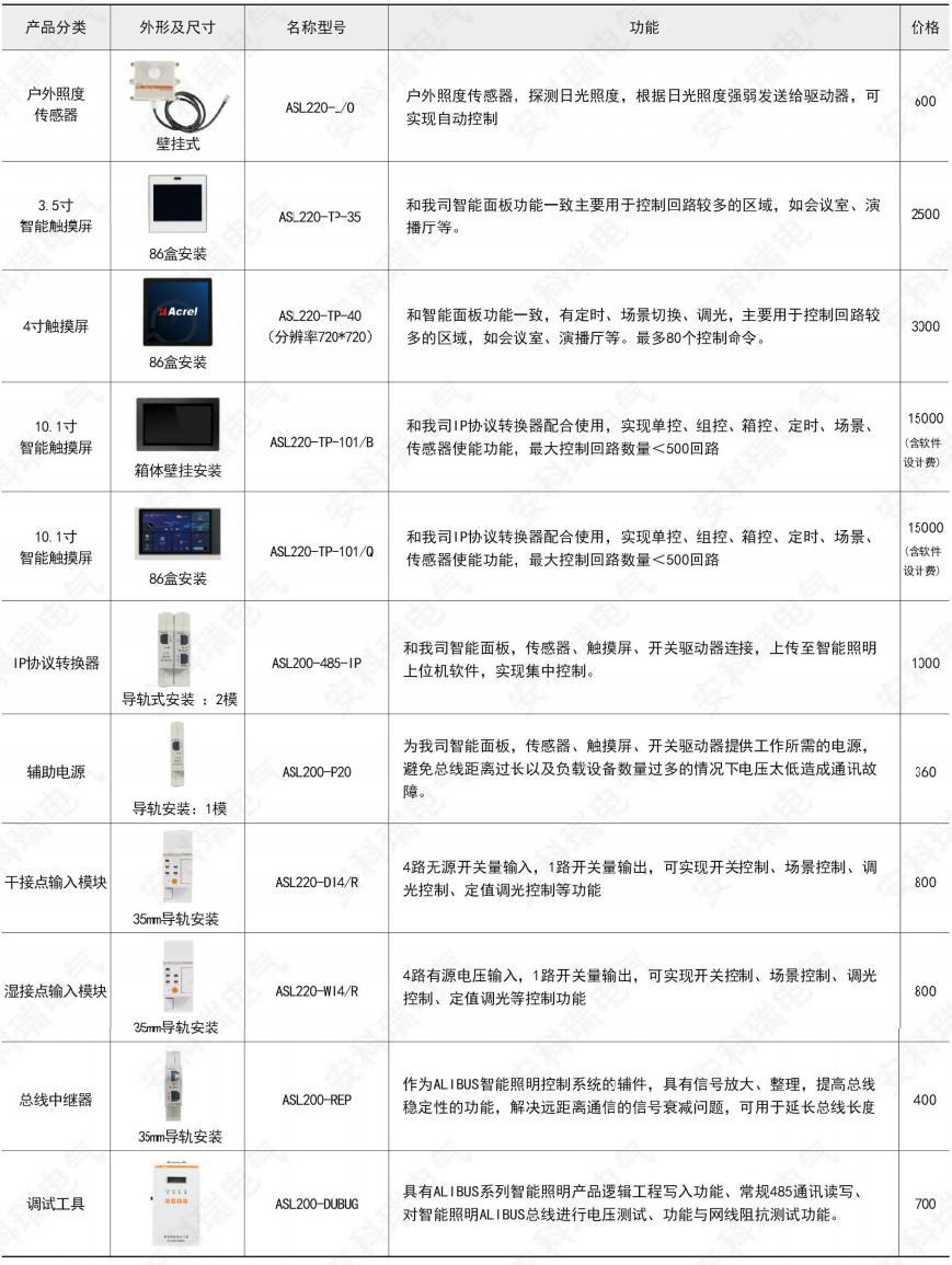 產品簡介:智能照明控制系統從功能上可以分為驅動器、傳感器和系統元件。各個元件通過專用Acrel-BUS總線以樹形、星形或線形的拓撲結構靈活組網。驅動器負責接收和處理傳感器傳送的信號,并執行相應的操作,如開/ 關燈、調節燈的亮度。傳感器負責根據現場手動操作,或探測光線、溫度等的變化,向驅動器發出相應的控制信號。系統元件主要負責搭建系統平臺,如系統電源、線路耦合器、傳輸介質等。