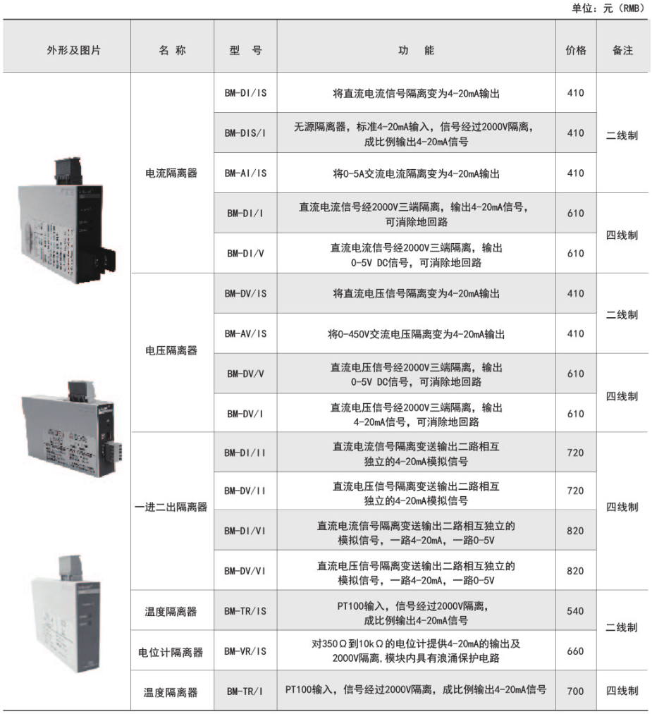 產品簡介:BM系列模擬信號隔離器可以對電流、電壓等電量參數或溫度、電阻等非電量參數進行高速精確測量,經隔離轉換成標準的模擬信號輸出。既可直接與指針表、數顯表相接,也可以與自控儀表(如PLC)、各種A/D轉換器以及計算機系統配接。