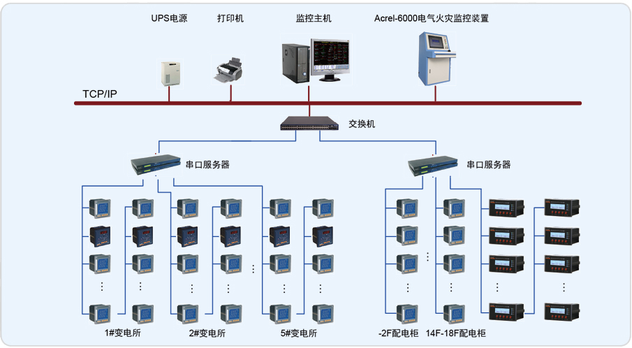 本項目采用Acrel-6000電氣火災監控系統,監控范圍主要為處于地下室的低壓配電間和各個樓層中的配電柜。客戶系統需求為探測漏電電流、過電流、超溫度等信號,發出聲光信號報警,準確報出故障線路地址,監視故障點的變化。儲存各種故障和操作試驗信號,顯示系統電源狀態。