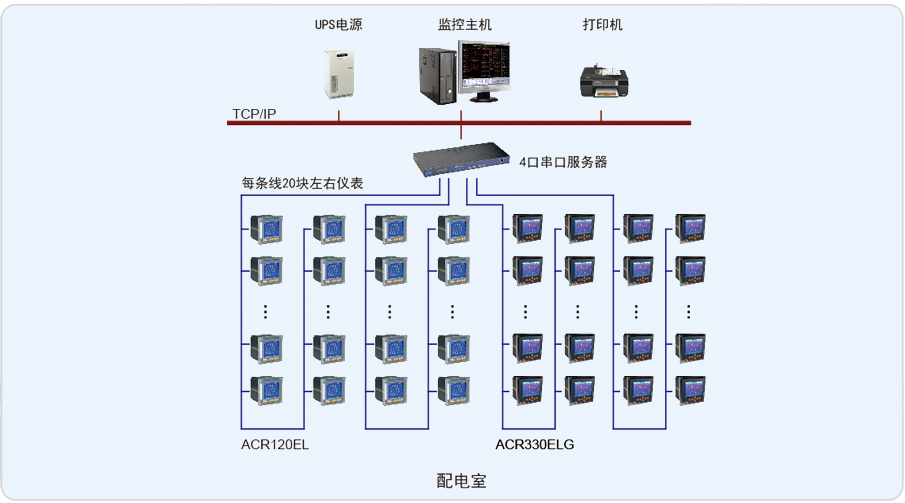 整個系統(tǒng)采用網絡分布式結構,監(jiān)控主機位于地下一層變電所值班室內,配電柜內安裝有本公司ACR330ELH、ACR120EL儀表共計60多回路。仁恒河濱花園電力監(jiān)控系統(tǒng)現場共1個低壓配電室,配電室內采用安科瑞ACR系列電力監(jiān)控儀表采集各回路的電流、電壓、電能等電參量,然后通過中間層采集設備網線到監(jiān)控室計算機上,實現遙測、遙信功能。