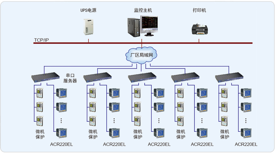 該系統總計有212只儀表(其中包括12只ACR230ELH、188只ACR220EL和12只ABB綜保),其中高壓室、發電機房、1#變電所的多功能儀表數據通過4根RS485總線直接上傳至監控室;2#、3#變電所采用4根RS485總線,拉設至2#變電所通訊采集箱內,通過光纖上傳至監控值班室;4#、5#變電所采用4根RS485總線,拉設至4#變電所通訊采集箱內,通過光纖上傳至監控值班室,再通過工業網絡交換機將數據統一上傳至監控主機。