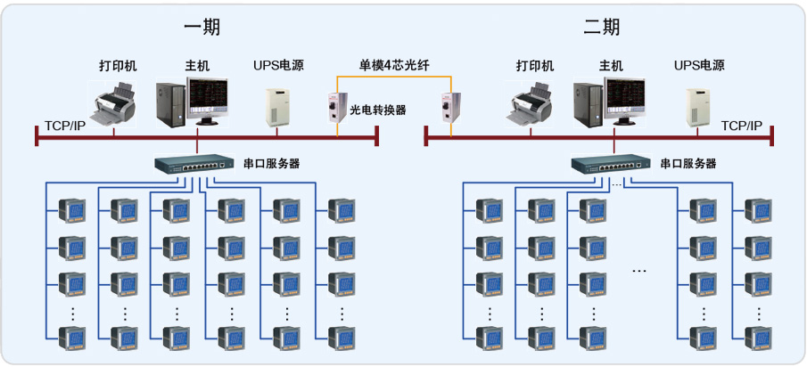 一期配電房由兩個(gè)相互獨(dú)立的配電房組成,動力中心配電房包含主室和次室,次室距主室的約30米。其中Acrel-2000電力監(jiān)控系統(tǒng)在動力中心配電室的次室里。動力中心配電房有2臺變壓器(1#變壓器、2#變壓器),共有57臺ACR120EL;現(xiàn)場采用4根屏蔽雙絞總線連接。生產(chǎn)車間配電房中有2臺變壓器(3#變壓器、4#變壓器),共有39臺智能儀表,現(xiàn)場采用2根RS485總線上傳至主機(jī)。