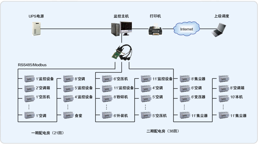 整個系統采用分布式結構,監控主機位于東區主辦公室內,一期配電房和二期配電房采用RS485總線直接接入監控主機擴展卡的串口。對于每個回路采用ADL 300-EF/C三相電能表,共59個回路;站控層應用國內知名的聯想商用計算機作為監控主機,同時設有用于報表打印輸出的打印機;防止異常斷電而引發的數據丟失的UPS設備。監控軟件平臺采用單機版Acrel-2000型電力監控系統。Acrel-2000型電力監控系統預留了擴展接口,可方便進行擴展。