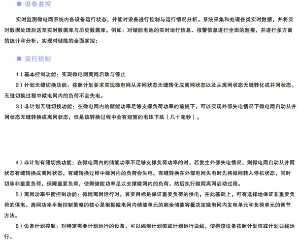 微電網(wǎng)能量管理控制系統(tǒng)用于保障微電網(wǎng)的穩(wěn)定和經(jīng)濟(jì)優(yōu)化運(yùn)行。其是一種計(jì)算機(jī)系統(tǒng),包括提供基本支持服務(wù)的軟件平臺(tái),以及提供使微電網(wǎng)內(nèi)發(fā)電、配電、用電設(shè)備有效運(yùn)行所需功能的一套應(yīng)用軟件,是微電網(wǎng)監(jiān)控系統(tǒng)核心,擔(dān)負(fù)著系統(tǒng)電源管理、負(fù)荷管理以及統(tǒng)計(jì)分析、評(píng)估等功能。微電網(wǎng)微電網(wǎng)能量管理控制系統(tǒng)基本功能包括數(shù)據(jù)信息采集和處理、數(shù)據(jù)庫(kù)管理、人機(jī)界面、設(shè)備控制等。系統(tǒng)控制功能包括微網(wǎng)運(yùn)行基礎(chǔ)控制、計(jì)劃無(wú)縫切換控制、外部故障下的無(wú)縫切換控制、離網(wǎng)功率平衡優(yōu)化控制、功率波動(dòng)平滑控制等。系統(tǒng)應(yīng)用功能包括分布式電源的運(yùn)行分析與展示、微網(wǎng)運(yùn)行效益分析、有功功率整體優(yōu)化控制、無(wú)功電壓整體優(yōu)化控制、電能質(zhì)量?jī)?yōu)化控制等。