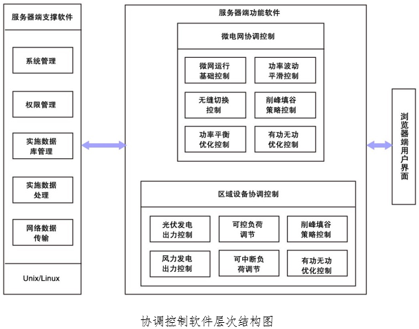 協(xié)調(diào)控制器采用B/S結(jié)構(gòu),包括硬件控制器、功能控制軟件和瀏覽器用戶工作界面。協(xié)調(diào)控制器的軟件體系結(jié)構(gòu)如下圖所示。協(xié)調(diào)控制器的服務(wù)器端包括支撐軟件和功能軟件兩部分。功能軟件包括微電網(wǎng)協(xié)調(diào)控制和設(shè)備協(xié)調(diào)控制。微電網(wǎng)協(xié)調(diào)控制功能包括微網(wǎng)運(yùn)行基礎(chǔ)控制、無(wú)縫切換控制、功率平衡優(yōu)化控制、功率波動(dòng)平滑控制、有功功率整體優(yōu)化控制、無(wú)功電壓整體優(yōu)化控制、電能質(zhì)量?jī)?yōu)化控制等。設(shè)備協(xié)調(diào)控制功能包括光伏發(fā)電出力控制、可控負(fù)荷調(diào)節(jié)、可中斷負(fù)荷調(diào)節(jié)、有功無(wú)功優(yōu)化控制。協(xié)調(diào)控制器的瀏覽器端是用戶工作界面,可觀察協(xié)調(diào)控制功能軟件工作狀態(tài)、配置參數(shù)、控制工作模式等。
