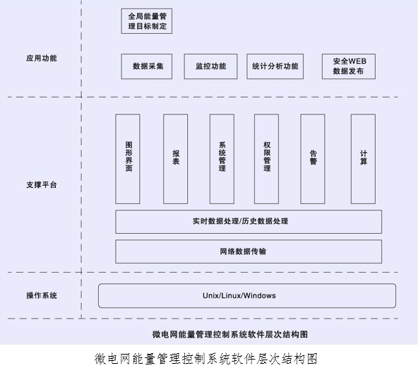 微電網(wǎng)能量管理控制系統(tǒng)軟件體系結(jié)構(gòu)由操作系統(tǒng)、支撐平臺(tái)、應(yīng)用功能共三個(gè)層次組成,應(yīng)用功能又分為基本應(yīng)用功能和高級(jí)管理功能兩個(gè)部分,如下圖所示。操作系統(tǒng)支持跨平臺(tái),支撐平臺(tái)包含數(shù)據(jù)采集管理、數(shù)據(jù)庫(kù)管理、網(wǎng)絡(luò)通信管理、圖形管理、報(bào)表管理、權(quán)限管理、報(bào)警管理、計(jì)算統(tǒng)計(jì)等模塊。基本應(yīng)用功能包括SCADA處理、監(jiān)控功能、統(tǒng)計(jì)分析功能、安全WEB數(shù)據(jù)發(fā)布等。高級(jí)管理功能包括全局能量管理目標(biāo)制定等。