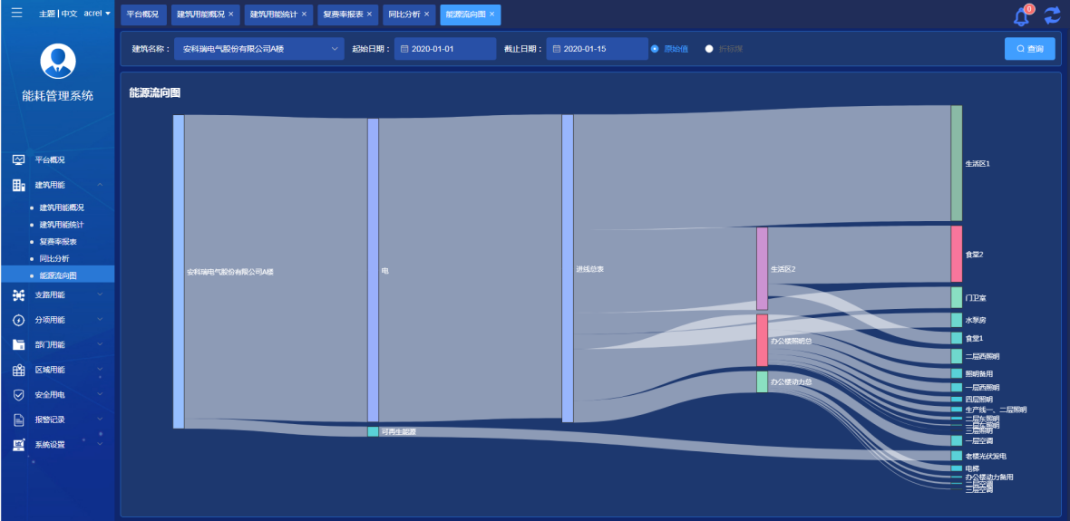 能源流向圖展示單棟建筑指定時段內各類能源從源頭到末端的的能源流向,支持按原始值和折標值查看。