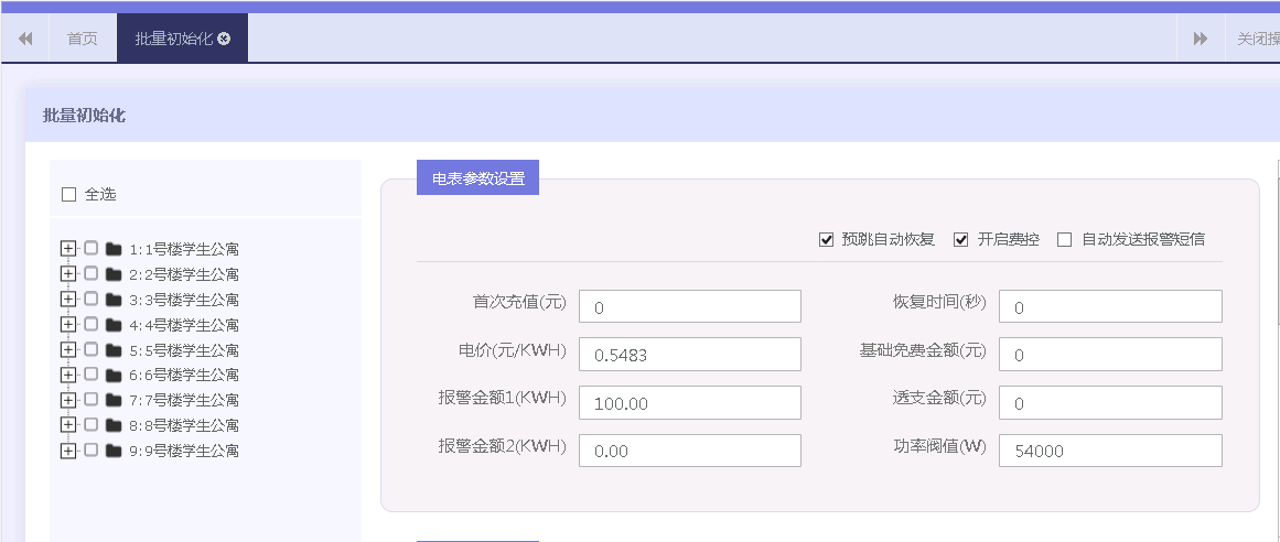 新生入學(xué)后為方便學(xué)校統(tǒng)計(jì)不受上屆學(xué)生使用影響,需要對(duì)宿舍電表進(jìn)行初始化,設(shè)置電表初始金額、電價(jià)、補(bǔ)助金額、報(bào)警金額、透支金額等,支持批量設(shè)置。