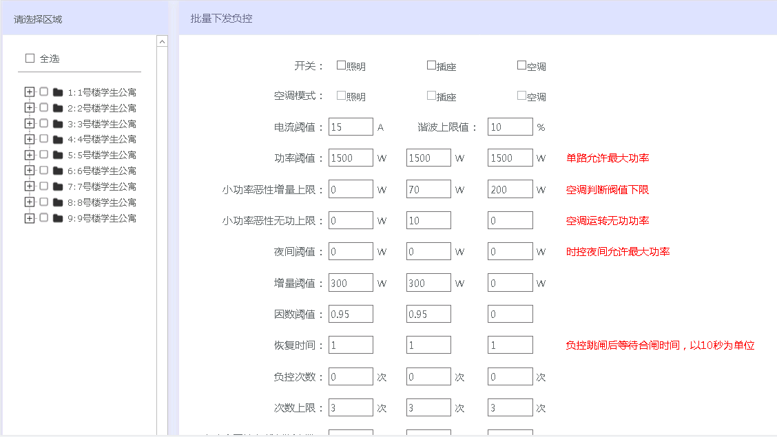 限制學(xué)生使用違章電器,當(dāng)接入未經(jīng)允許的違章電器時(shí),支路跳閘??照{(diào)模式:空調(diào)模式下,電表持續(xù)檢測(cè)空調(diào)微弱待機(jī)電流,一但存在拔斷空調(diào)插座的動(dòng)作,電表便跳閘,且只能通過(guò)聯(lián)系管理人員進(jìn)行合閘送電。允許除空調(diào)模式以外的跳閘動(dòng)作自動(dòng)合閘。允許次數(shù),跳閘等待時(shí)間可設(shè)置,支持批量設(shè)置。