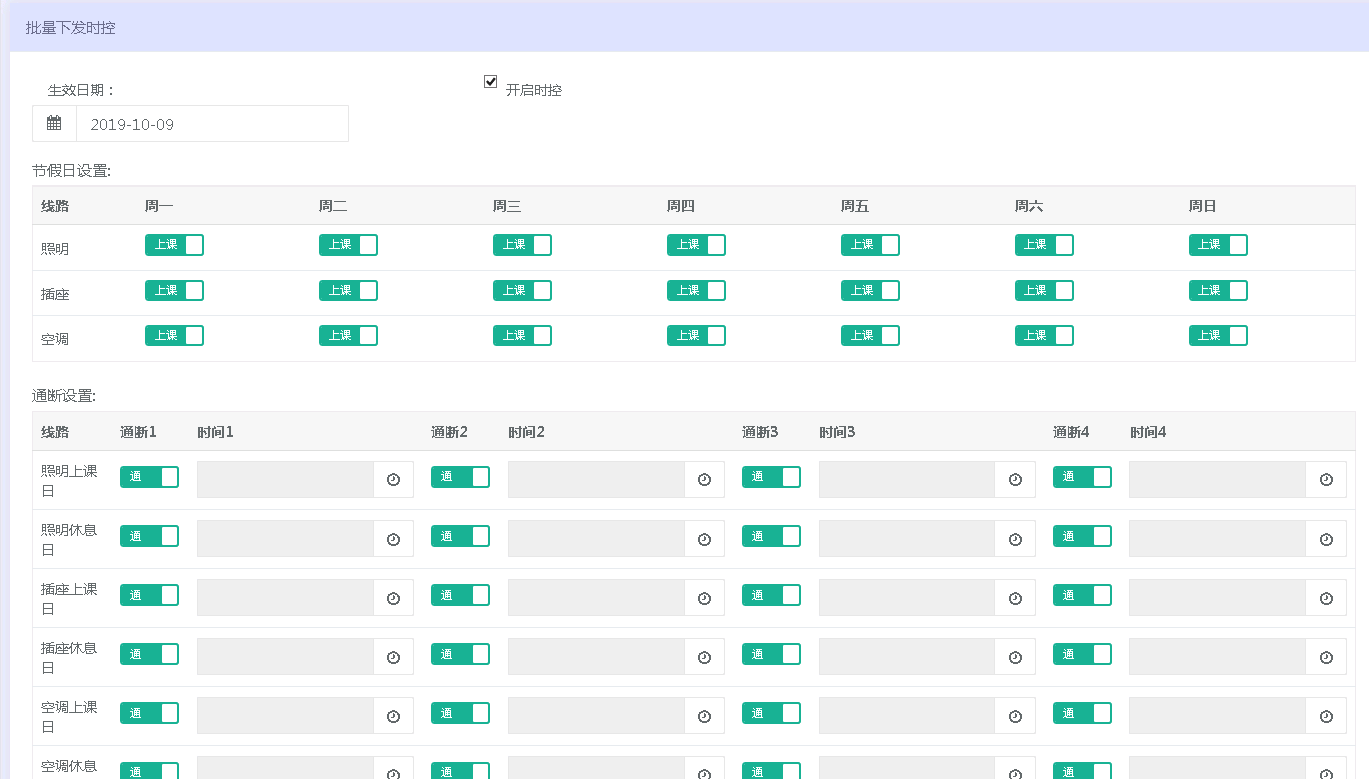 為方便學(xué)校管理學(xué)生作息,系統(tǒng)可以設(shè)置多個(gè)時(shí)間段,定時(shí)控制宿舍斷電送電時(shí)間。每個(gè)回路可單獨(dú)設(shè)置,可以區(qū)分上課日和雙休日,支持8個(gè)時(shí)段,參數(shù)下發(fā)至電表,由電表獨(dú)立控制回路通斷,不受通訊問(wèn)題影響。