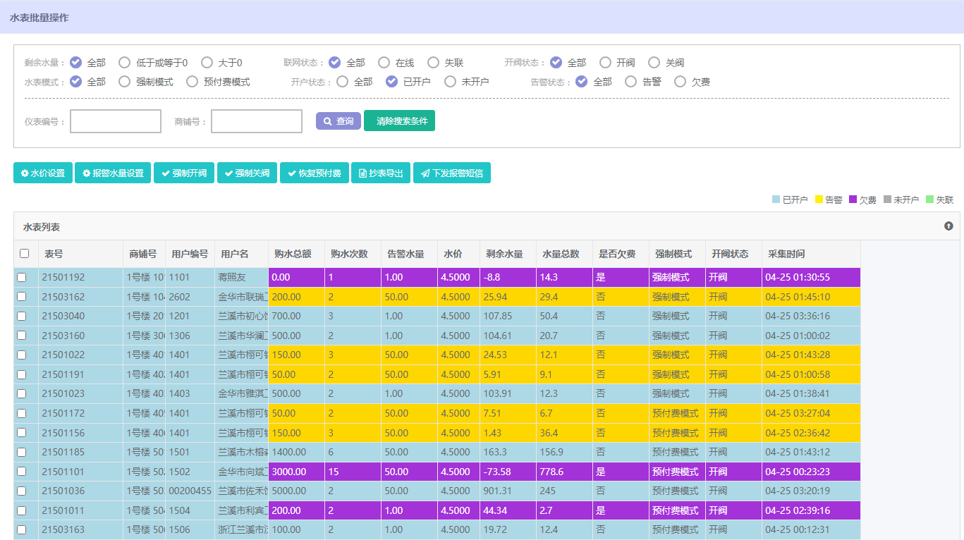 批量遠(yuǎn)程操作場(chǎng)景中,系統(tǒng)提供了多項(xiàng)功能,針對(duì)開戶、報(bào)警1、報(bào)警2、欠費(fèi)、未開戶、失聯(lián)狀態(tài)都有不同的顏色顯示:1.電價(jià)下發(fā);2.設(shè)置下發(fā);3.保電(強(qiáng)制合閘);4.恢復(fù)預(yù)付費(fèi)(欠費(fèi)自動(dòng)跳閘);5.拉閘(強(qiáng)制斷電);6.抄表導(dǎo)出(導(dǎo)出當(dāng)前所有表狀態(tài)為XLS)