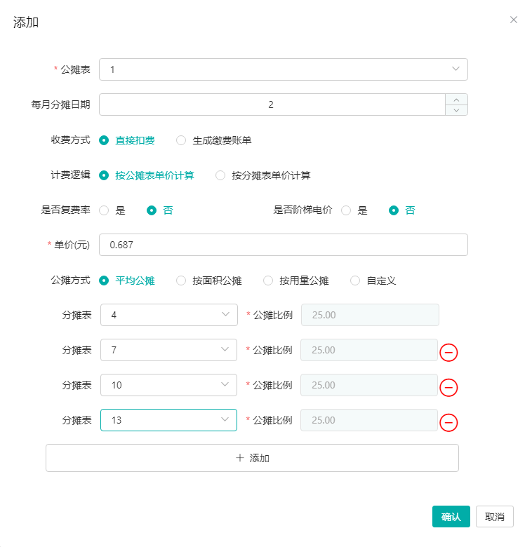 支持公區(qū)電費(fèi)分?jǐn)?,每月自?dòng)將公攤表用能按照設(shè)置好的規(guī)則下發(fā)給對(duì)應(yīng)的分?jǐn)偙恚瑴p輕物業(yè)公區(qū)統(tǒng)計(jì)收費(fèi)壓力。