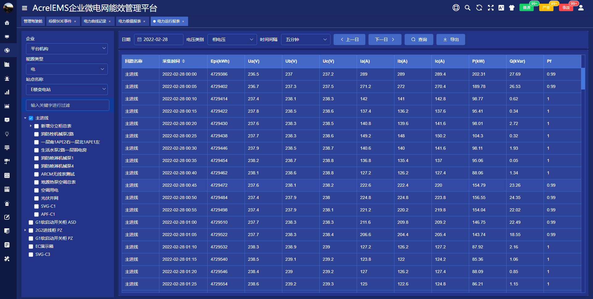 查詢各回路或設備指定時間的運行參數,報表中顯示電參量信息應包括:各相電流、三相電壓、總功率因數、總有功功率、總無功功率、正向有功電能等.