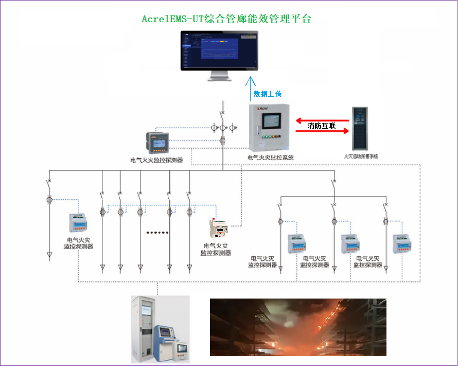 電氣火災(zāi)監(jiān)控系統(tǒng)作為火災(zāi)自動報警系統(tǒng)的預(yù)警子系統(tǒng),由電氣火災(zāi)監(jiān)控主機、電氣火災(zāi)監(jiān)控單元、剩余電流式電氣火災(zāi)探測器以及測溫式電氣火災(zāi)探測器組成,通過現(xiàn)場消防環(huán)網(wǎng)和消防總線構(gòu)成一套完整的預(yù)防電氣火災(zāi)的監(jiān)控系統(tǒng),數(shù)據(jù)可集成至管廊的AcrelEMS-UT能效管理系統(tǒng)并提供預(yù)警信號。