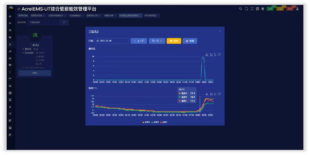 針對現(xiàn)場設(shè)置的傳感器監(jiān)測配電系統(tǒng)回路的漏電電流和線纜溫度,異常時實時發(fā)出報警信號。