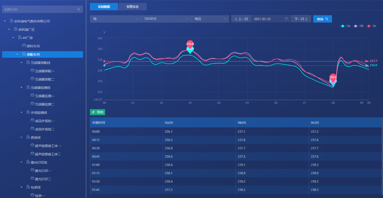 對企業各點位的能源使用、報警等情況進行實時的監控。以便企業用戶能夠實時的監測各個點位的運作情況,同時能更快速高效的掌握點位的報警,并為企業削峰填谷、調整負載等技改措施提供數據支撐。