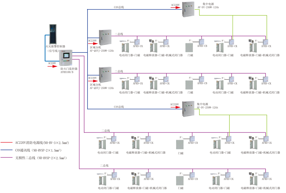 本系統可與火災自動報警系統聯動,當發生火情時,可接收火災報警系統發出的信號,并通過總線,將指令發布到每個終端,自動關閉所有常開防火門,隔離火源和煙霧。