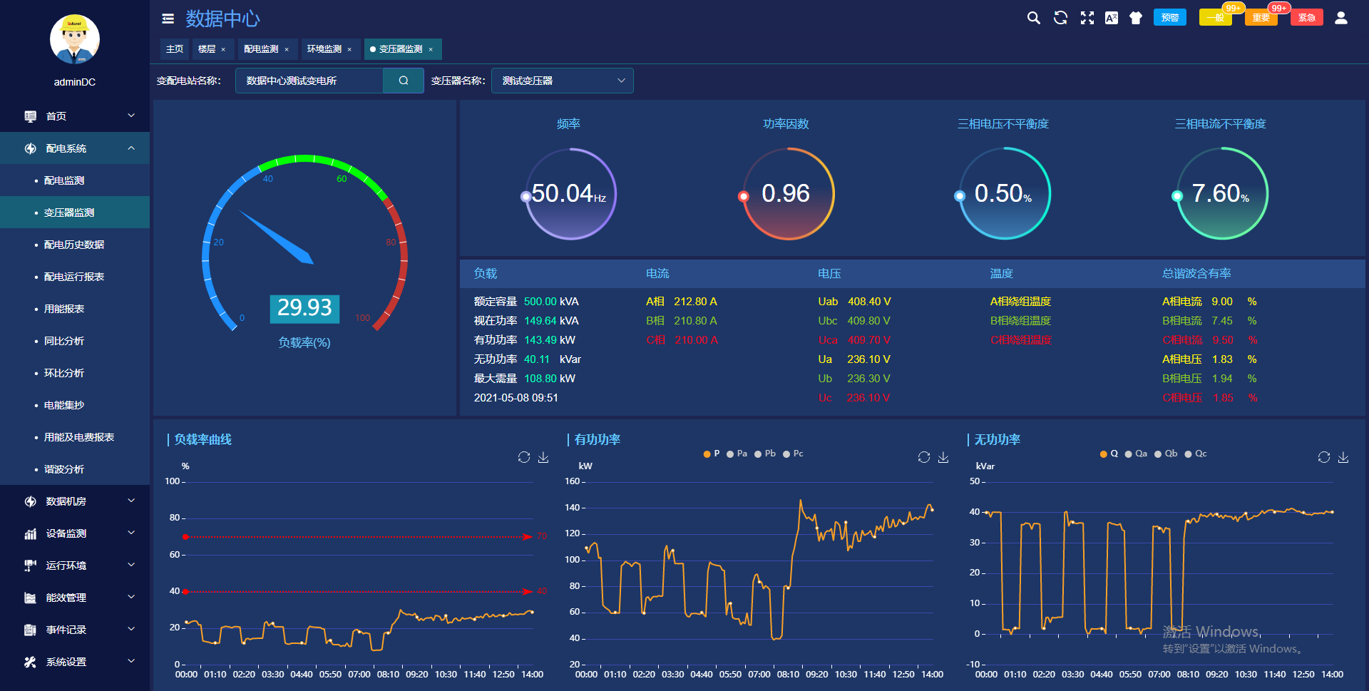 變壓器監測監測頁面實時監測各變壓器各項參數,包括福賊率。頻率,功率因數,三相不平衡度等,并且顯示歷時曲線圖,數據實時變化。幫助用戶直觀監測各變壓器運行狀態。