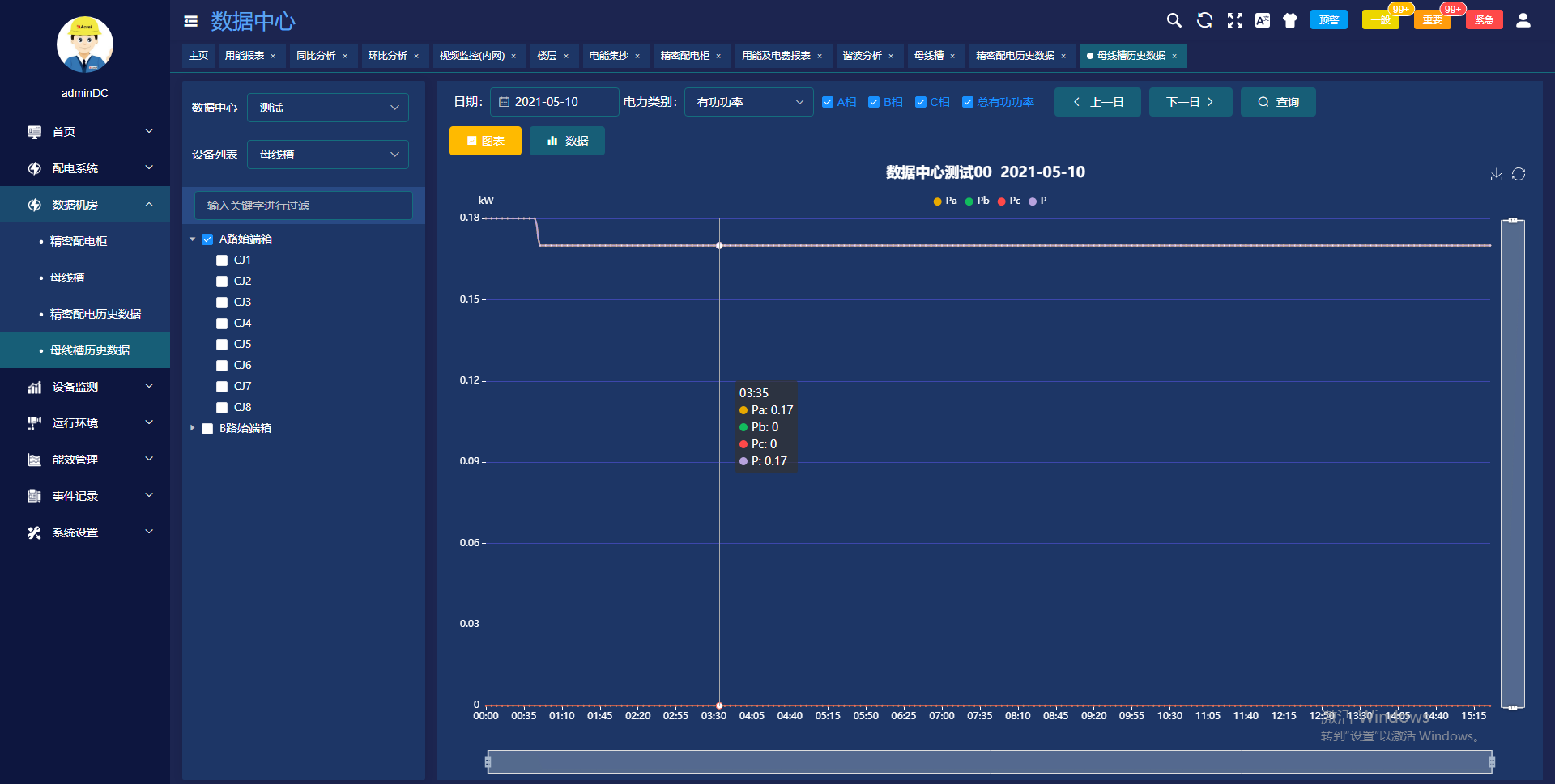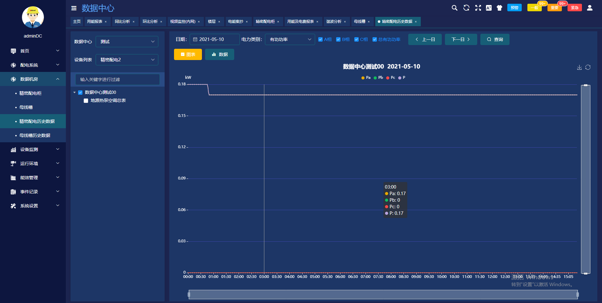 本頁面顯示精密配電設備下所有分支回路的電力參數,支持歷史數據的查詢。如