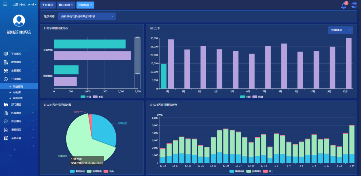 展示當(dāng)前建筑的照明插座、空調(diào)、動力和特殊用電,通過餅圖、柱狀圖顯示能源占比、同比對比以及分項用能趨勢。