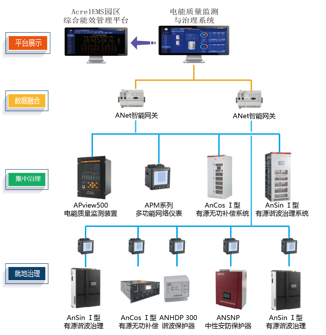 為了消除配電系統(tǒng)諧波對(duì)配電系統(tǒng)設(shè)備的影響,方案配置安科瑞AnSin有源濾波器和AnCos有源無(wú)功補(bǔ)償裝置,濾除電網(wǎng)2~31次諧波干擾,提高系統(tǒng)功率因數(shù)。